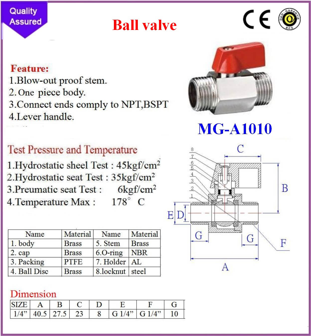 The brass ball valve is 1/4" Female x 1/4" Male and NPT level ,the red handle can be choice