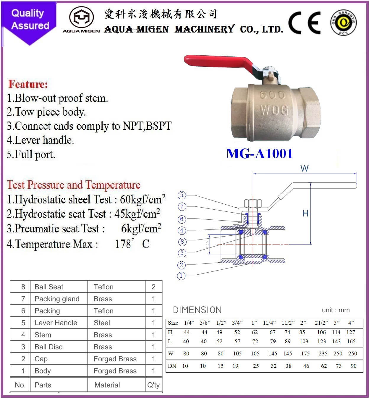 2.Hydrostatic seat Test :  45kgf/cm2