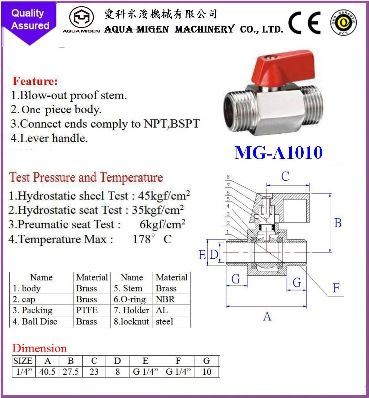 2.Hydrostatic seat Test : 16kgf/cm2