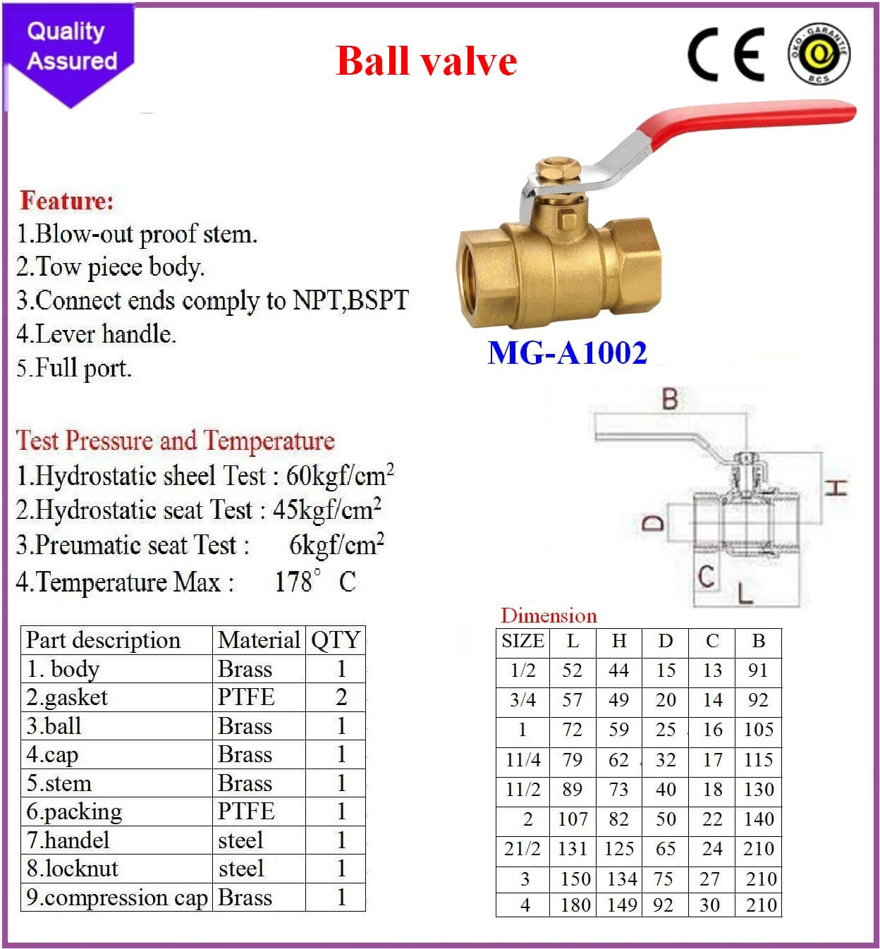 2.Hydrostatic seat Test : 45kgf/cm2