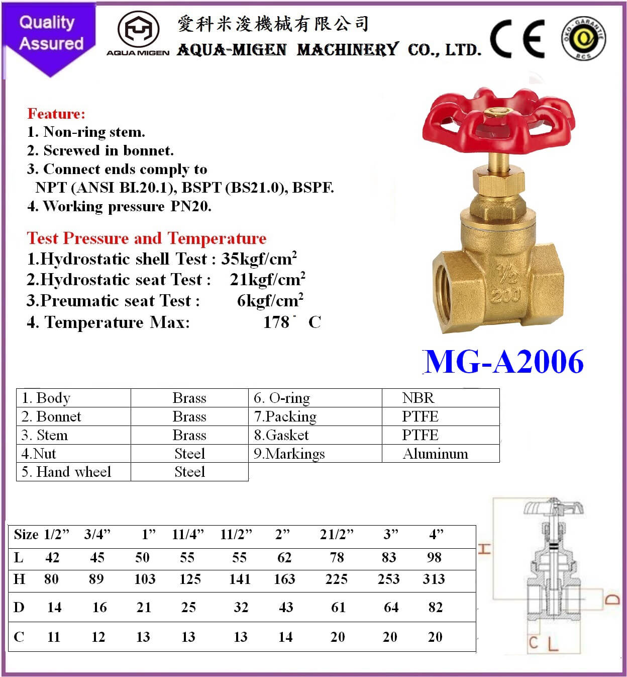 2.Hydrostatic seat Test : 21kgf/cm2